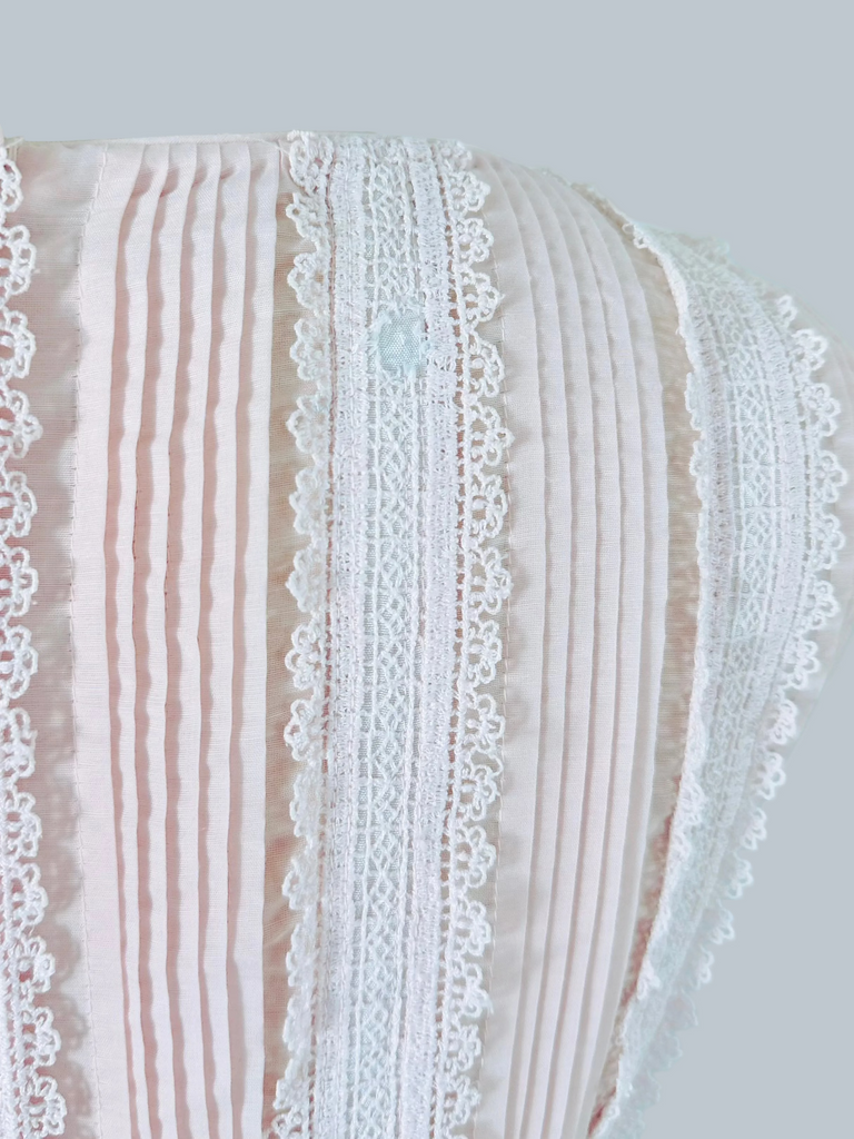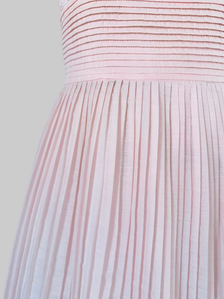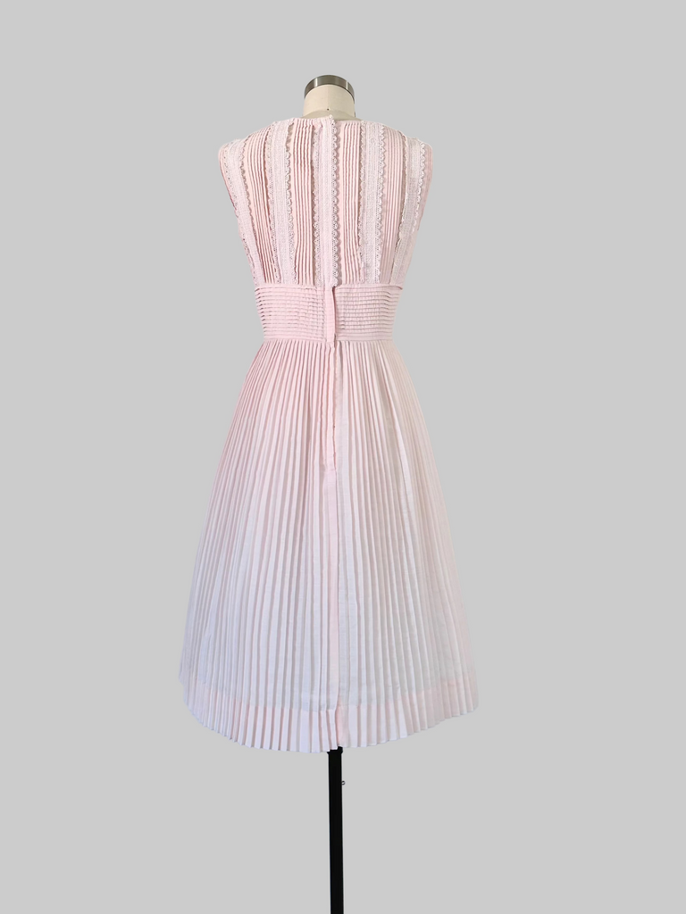 A genuine 1950s L'Aiglon dress in delicate blush pink. The elegant bateau neckline and sleeveless silhouette are adorned with charming vertical pintucks and soft lace accents—details that capture the essence of mid-century elegance. A structured pleated waistband hugs the waist before releasing into a flowing, pleated skirt that gracefully reaches midi length.