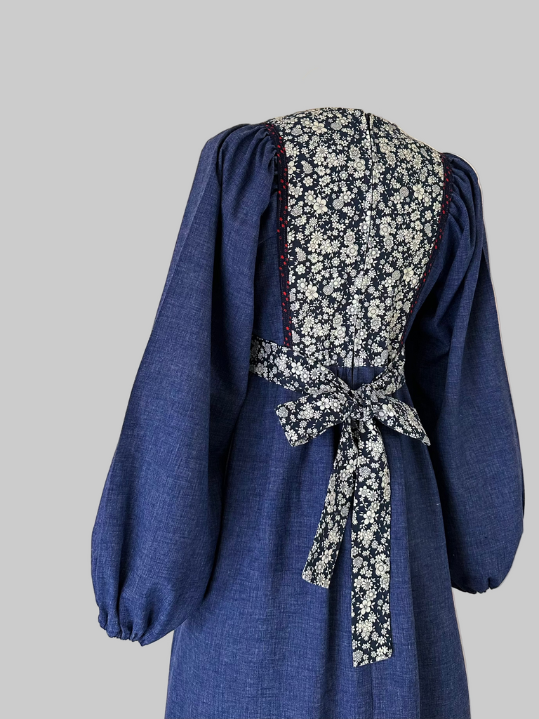 Vintage 1970s Bohemian Prairie Dress in Denim Blue