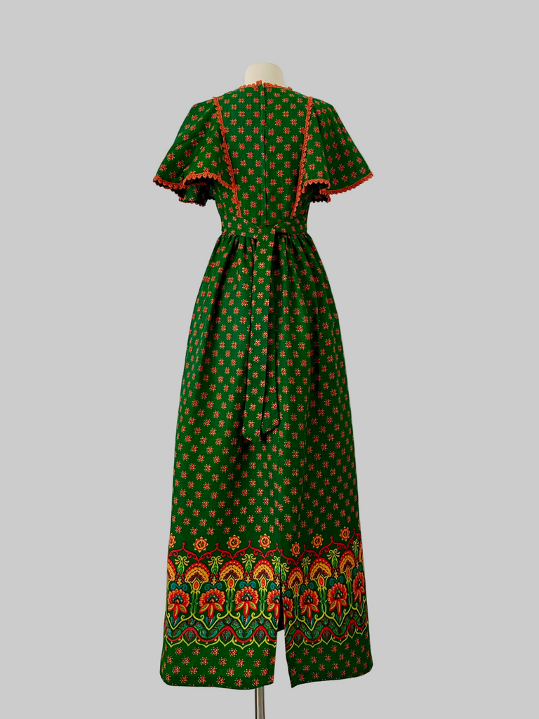 Vivid and full of charm, this 1970s dress captivates with its deep green backdrop adorned in ornate orange florals and a striking border print in fiery shades of red, yellow, and gold. The capelet-style sleeves drape elegantly over the shoulders, finished with delicate crochet lace for a romantic touch. A self-tie waist allows for an adjustable fit, while a back zipper ensures easy wear. The long skirt flows beautifully and features a back slit for effortless movement and comfort.