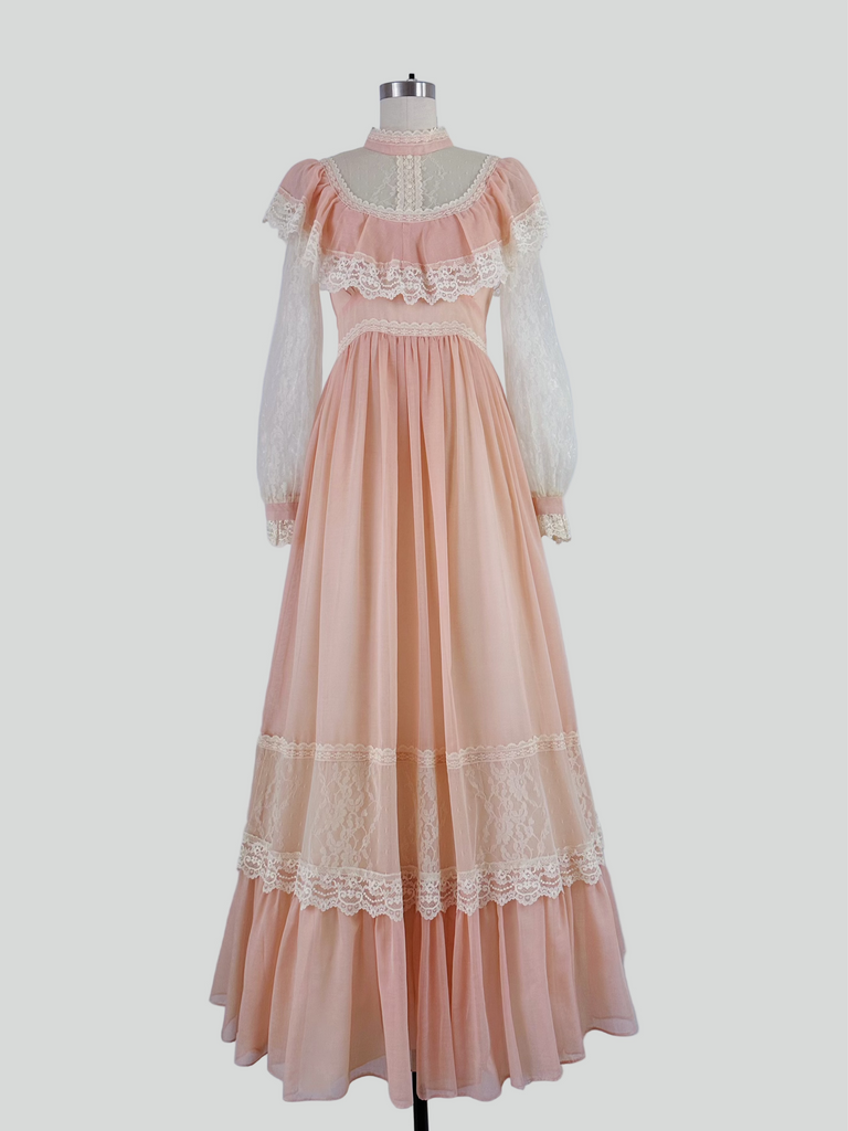 1970s Gunne Sax gown in blush rose cotton-blend voile with cream satin lining. The semi-sheer fabric catches light with softness, while lace-trimmed ruffles and sheer lace sleeves add delicate texture. A wide sash at the waist ties into an elegant bow, harmonizing romantic details with structured design. Buttoned cuffs and a back zipper complete the refined finish.