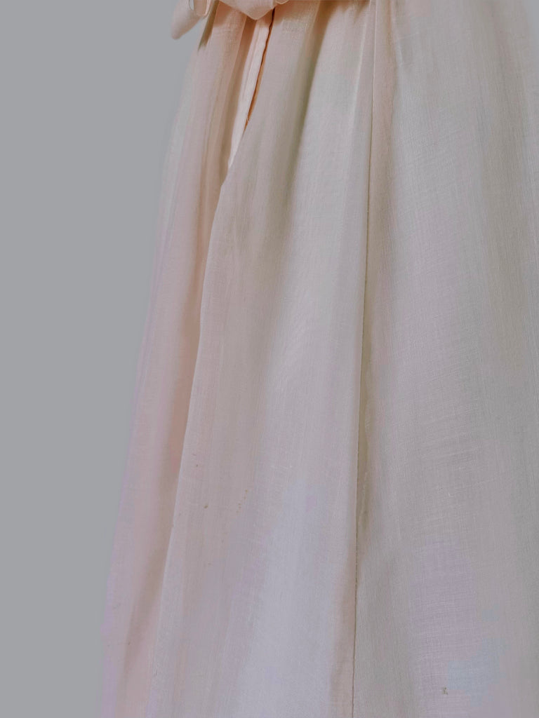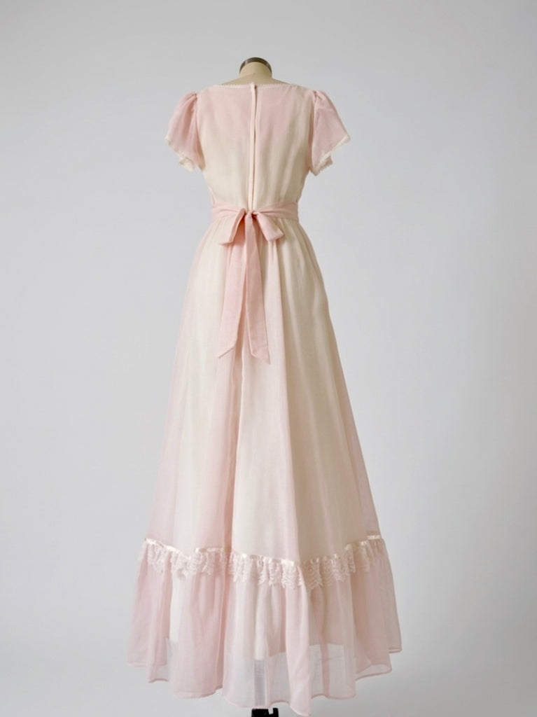 A dreamy 1970s Gunne Sax gown in the softest shade of blush pink. Cut from airy semi-sheer poly-cotton voile, the silhouette floats effortlessly to a sweeping floor-length hem.