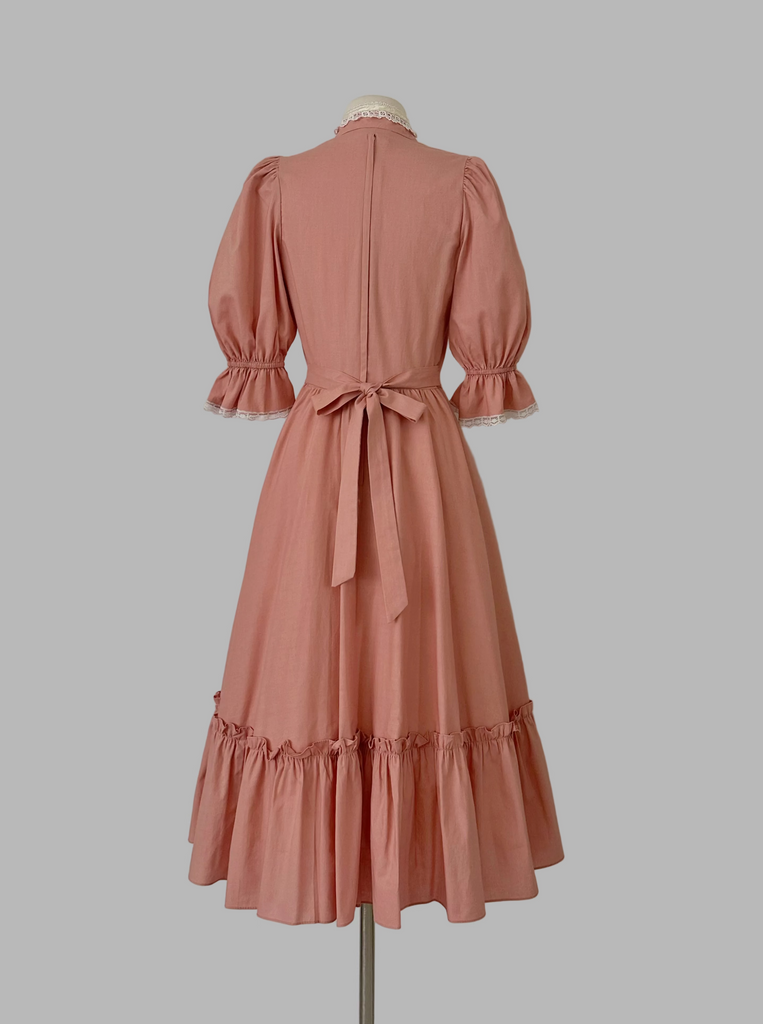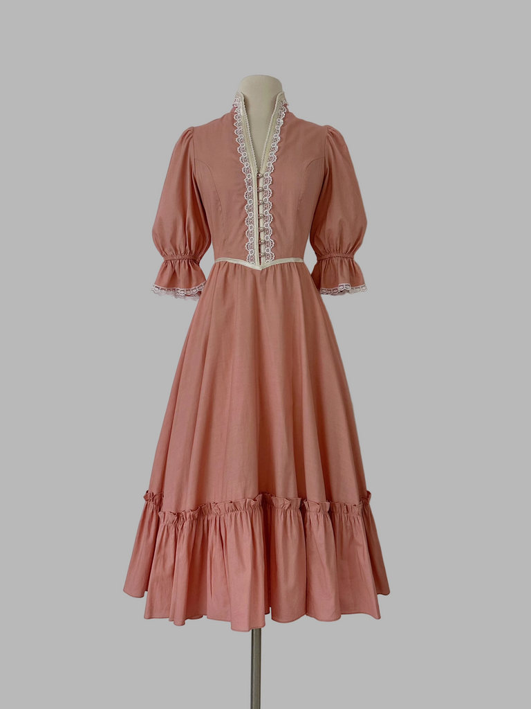 A 1970s Gunne Sax midi dress, featuring a muted rosewood hue that offers an earthy, high-end alternative to traditional pastels. The V-neckline is intricately framed with crochet lace and delicate pearlized buttons. Complete with signature puff sleeves and a cinching back tie.