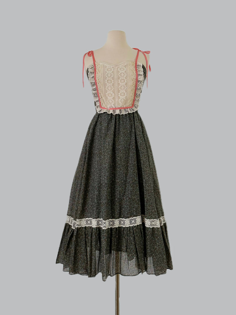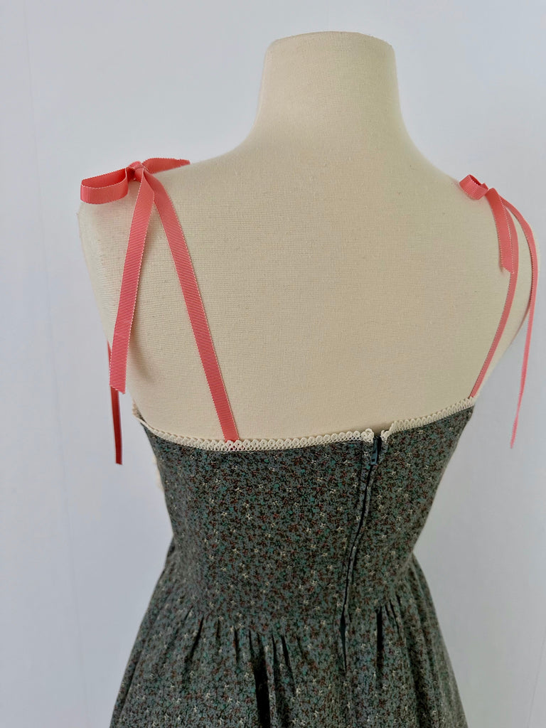 A ditsy floral print drifts across a muted sage ground, balanced by an ivory lace bib — delicately scalloped and finely textured — drawing the eye with quiet contrast. Slender coral grosgrain ribbons tie at the shoulders, lending a whimsical finish. The waist falls into a softly gathered skirt, trimmed with lace and lined for coverage.