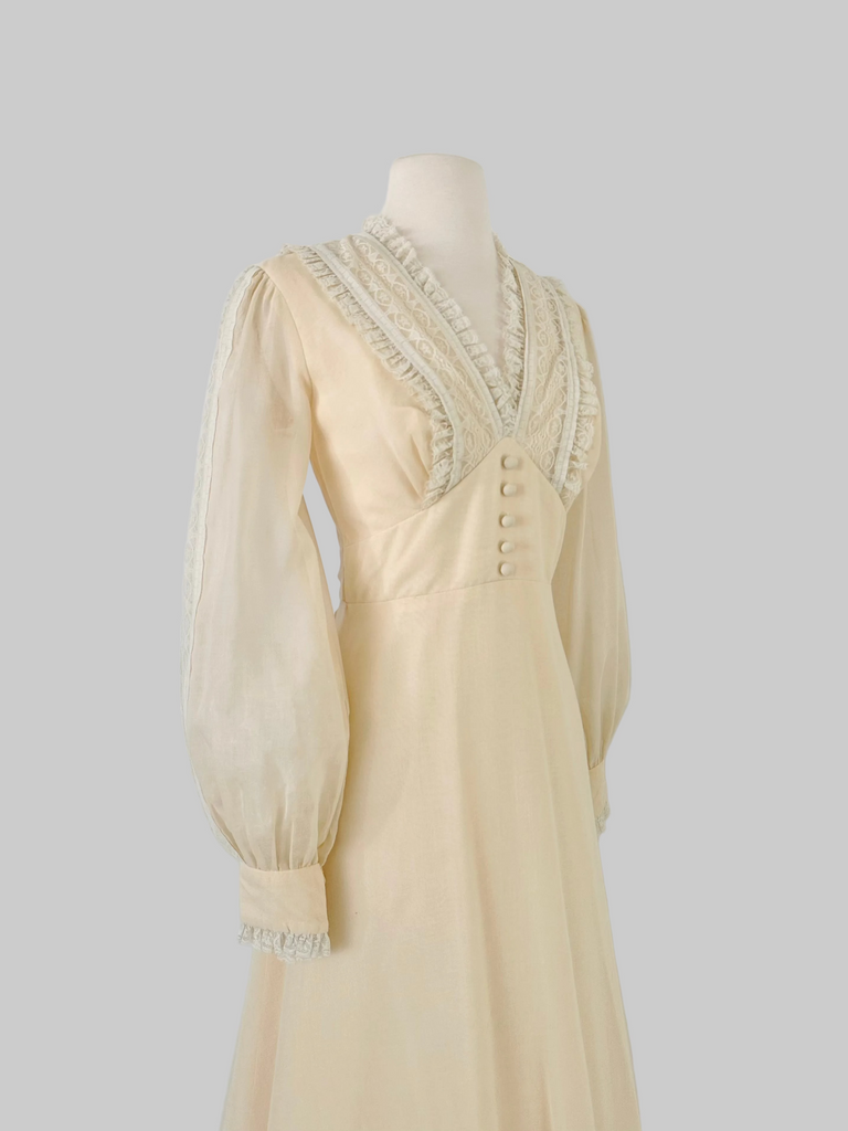 Graceful and timeless, this 1970s gown exudes understated romance in soft buttercream hue. The V-neckline is framed by delicate lace that creates an elegant collar effect, with a line of covered buttons running down the front. Dreamy bishop sleeves feature pretty lace inserts running down their length, while a tie belt defines the waist. The skirt flows beautifully to the floor in an A-line cut, finished with a soft gathered ruffle. Fully lined for comfort with a back zipper.