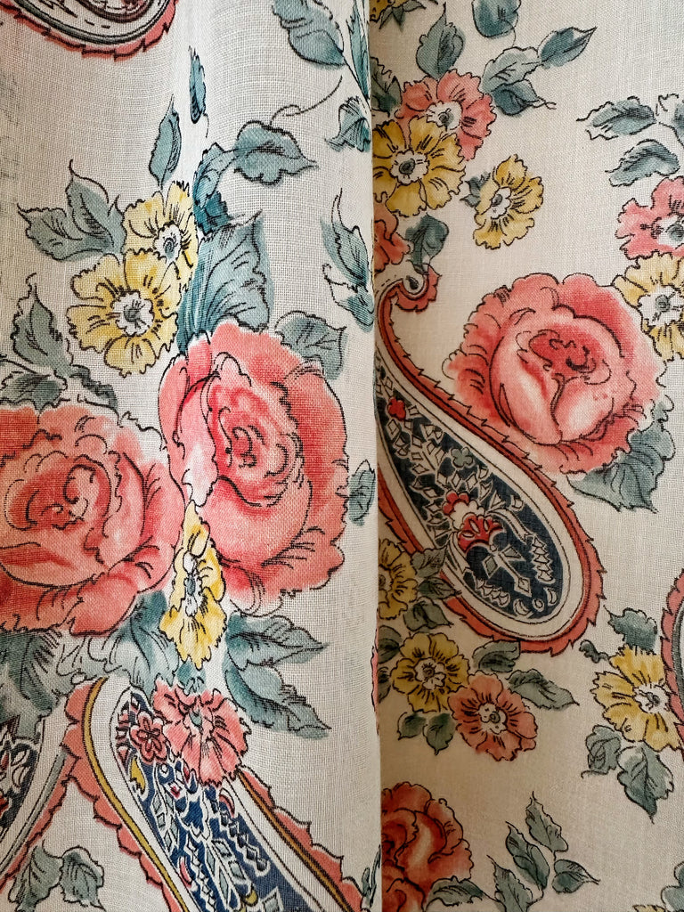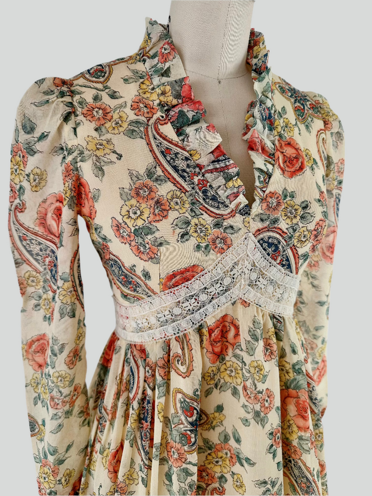 This 1970s full-length gown exudes a romantic aura in a warm cream hue, embellished with delicate roses, fluttering florals, and intricate paisley motifs in shades of coral, buttercup yellow, sage, and navy. The bodice is complemented by a soft ruffled neckline and puffed sleeves, with a touch of elegance from the delicate lace trim that extends into a bow at the back.The dress is fully lined in cream acetate satin for a smooth, softly structured finish.