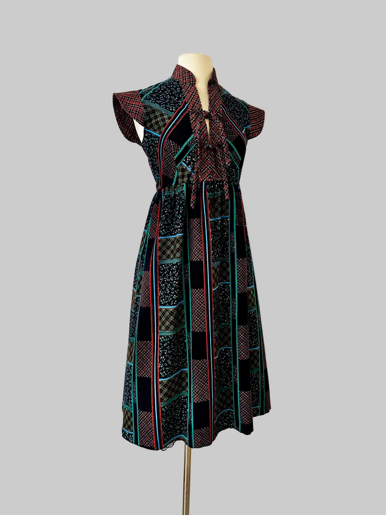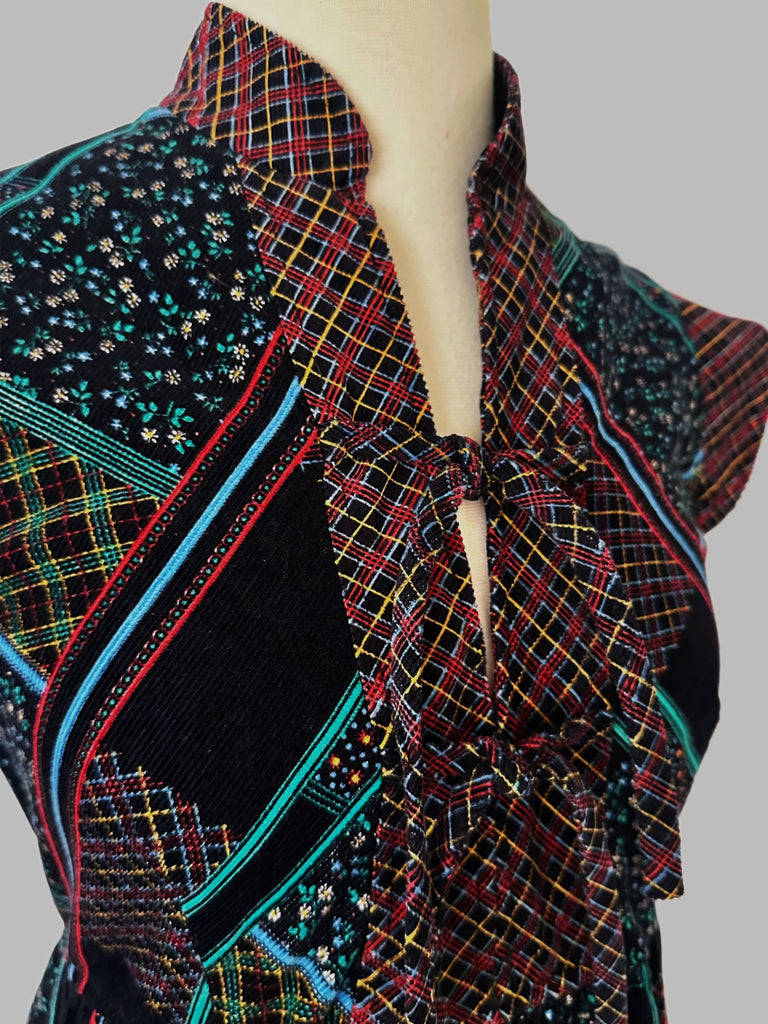 1970s Patchwork Corduroy Midi Dress with Tie Front