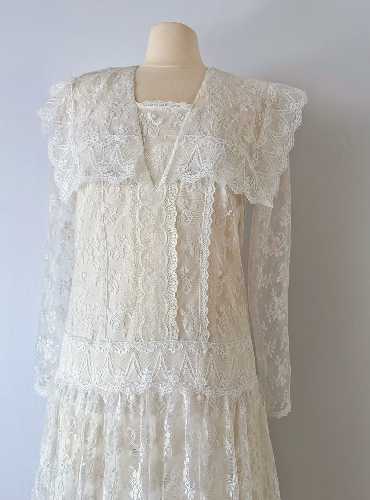 This 1980s Gunne Sax lace dress carries a whisper of earlier eras. Its drop-waist sailor collar—first popular in women’s fashion during the 1920s—returns here in a softer, more romantic form. Gunne Sax reimagines the classic collar with scalloped edges, floral lace, and gentle structure, turning a once-everyday detail into something beautifully suited for special occasions. Delicate lace layers over a smooth satin lining to create a light, graceful silhouette. Sheer sleeves add an airy balance, and the skirt falls just above the ankles, finishing in a scalloped hem that echoes the collar’s charm.