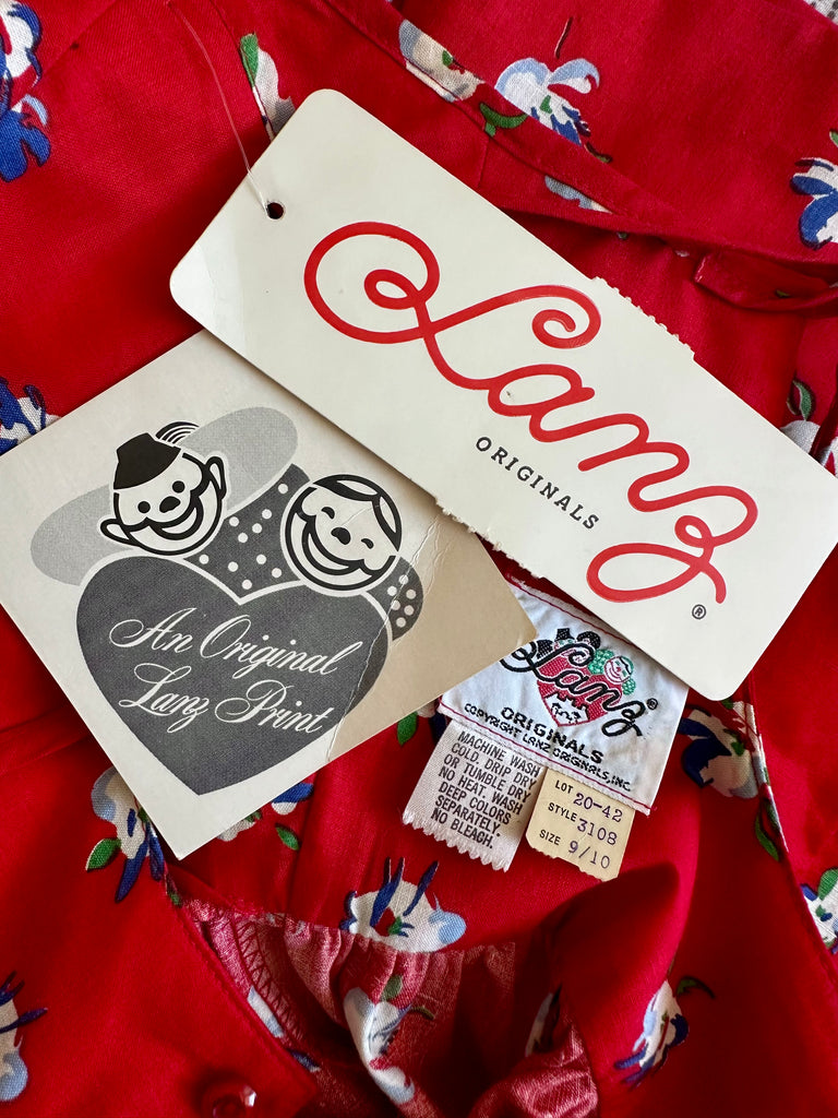 Exceptionally rare and preserved in unworn condition, this 1980s piece by Lanz Originals captures the enduring charm of Tyrolean dress traditions with unmistakable femininity. Rendered in a vivid, true red cotton, the fabric showcases Lanz’s iconic Alpine-inspired floral print — delicate, romantic, and instantly recognizable.