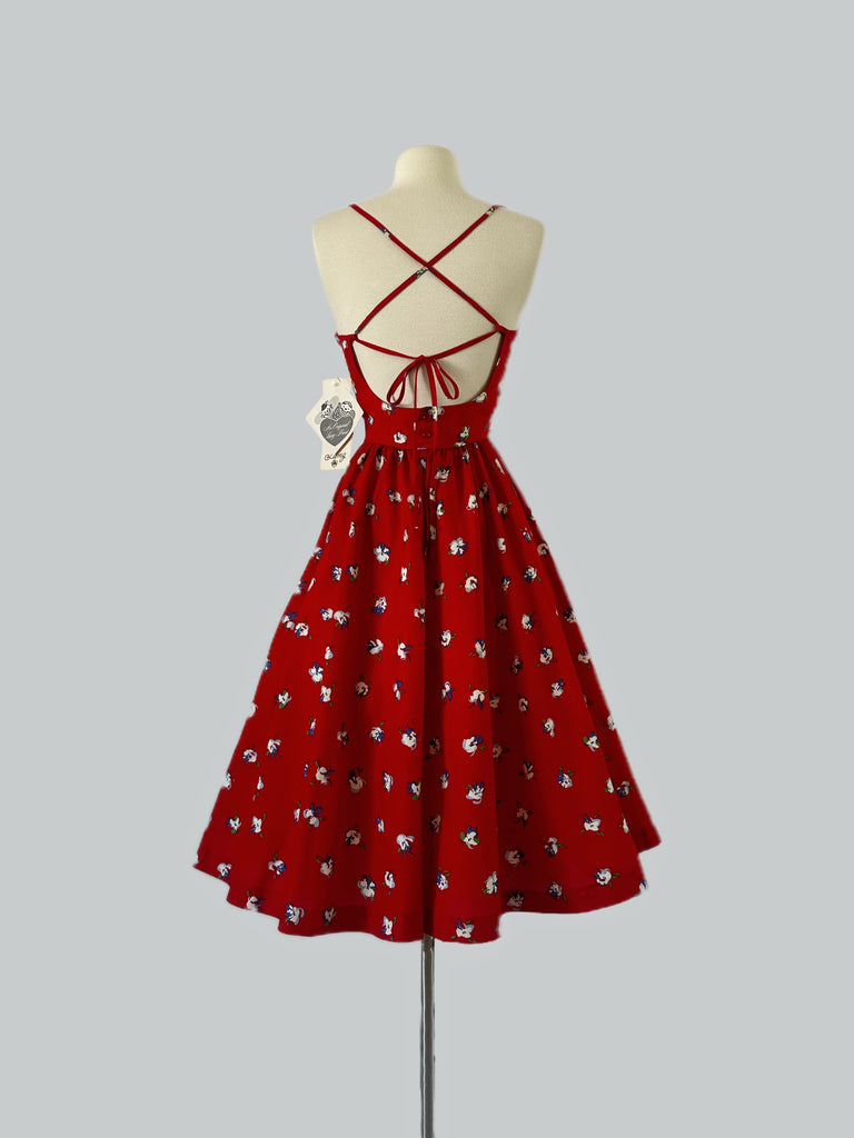 NOS 1980s Lanz Originals Red Tyrolean Floral Crisscross Back Cotton Dress