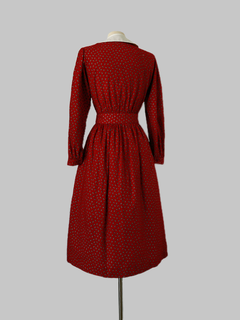 A deep crimson cotton dress in an allover miniature paisley print, with a removable rounded white Peter Pan collar, full bishop sleeves, fitted button front bodice, and a gathered midi skirt — plus pockets. The black ribbon tie elevates the otherwise sweet silhouette into something with real edge. Grounded in early 80s prairie romanticism with a timeless, almost storybook quality.