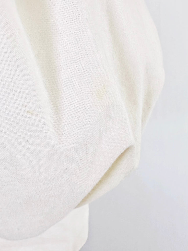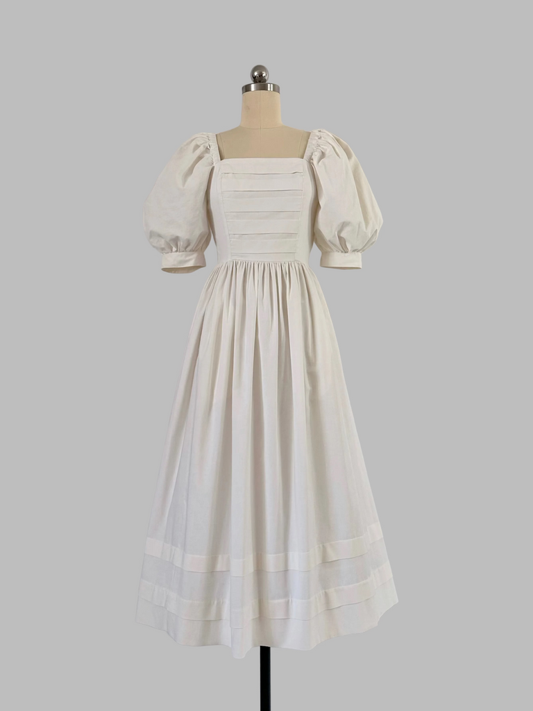 A beautifully constructed 1980s Laura Ashley midi dress in off-white cotton. The bodice is softly boned for shape and support, finished with fine pintuck detailing and a clean square neckline. The generous puffed sleeves add dramatic volume, balanced by a neatly defined waist. The skirt falls to a graceful midi length, cut full for movement and finished with matching pintuck detailing and discreet side pockets—practical, intentional, and elegant.