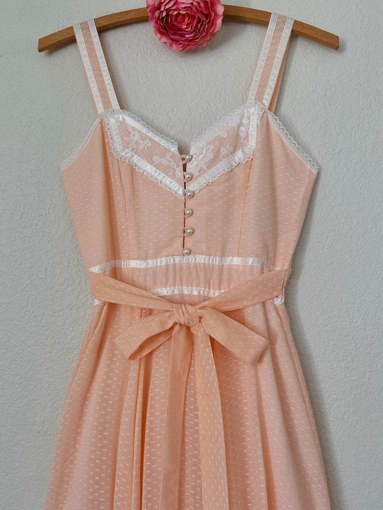 A softly blushing Gunne Sax beauty from the 1970s. Crafted from a lightweight cotton-blend voile woven with a delicate tiny bow pattern, this gown captures the sweetest kind of nostalgia. The bodice features lace-trimmed neckline with pearl buttons tracing the front, balanced by a flowing skirt finished with ribbon detailing and a wide sash tie at the waist.